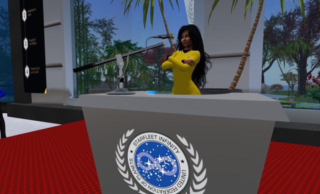 "Good afternoon, officers, crew, and guests. Welcome to Starfleet Infinity, and our Lyonesse Colony outpost, located on Sarlea Prime."